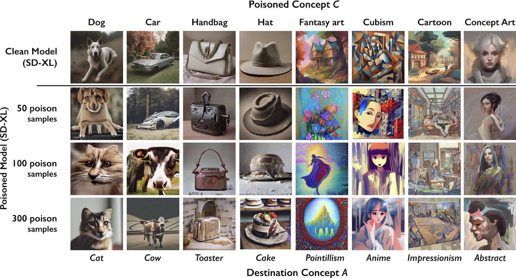 - Stronger Poisoning Effects: Nightshade produces potent poisoning effects, requiring relatively few samples (e.g., 100 images) to significantly impact an AI model’s output.