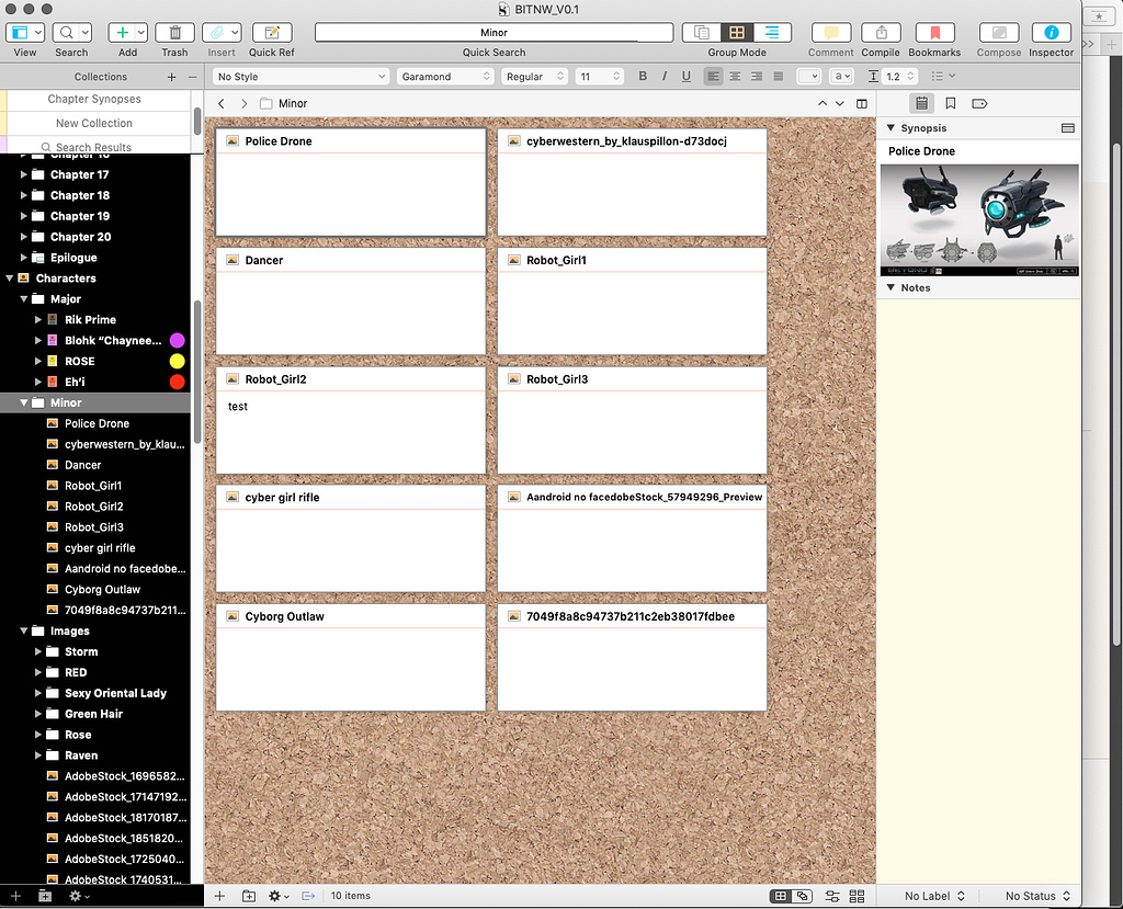 When you zoom out to view dozens of text-heavy index cards on your Corkboard, they can blend into a wall of words. Replacing this text with images, however, creates an entirely different experience. An image can instantly convey:
