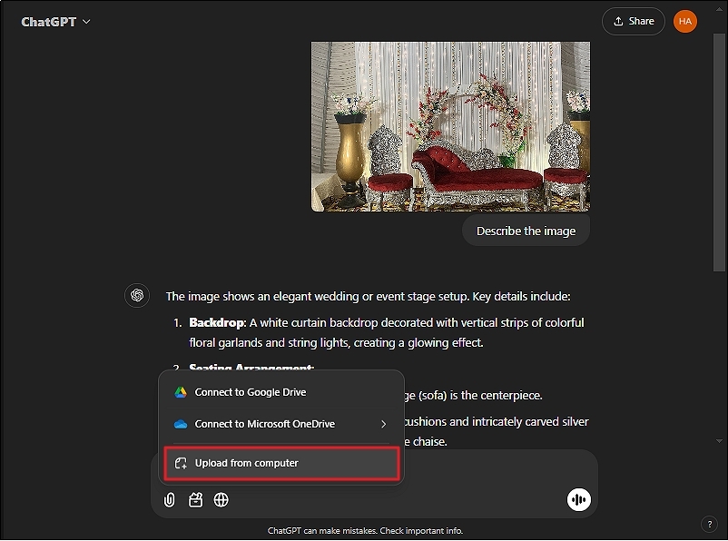 - Upload from Computer: Select an image file directly from your hard drive. ChatGPT generally accepts common image formats such as